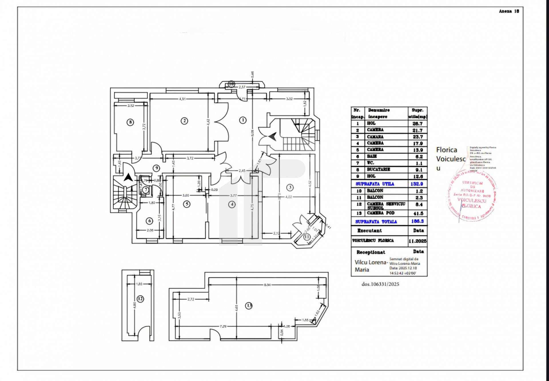 Apartamentul are o suprafata utila de 132,9 mpu, 2 balcoane 1, 2 si 2,3 mpu, la care se adauga, o boxa (camera de serviciu la subsol),  de 8,4 mp si o camera in pod, in suprafata de 41,5 mpu (suprafata totala 186.3 mpu) .